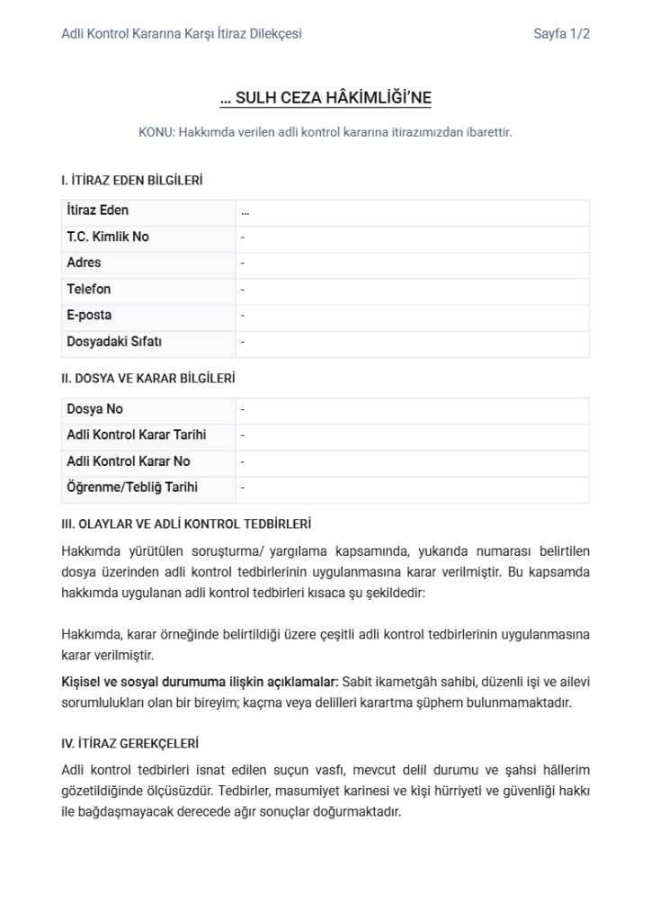 Adli Kontrol Kararına İtiraz Dilekçeni, 5 dakikada senden istenen bilgileri girerek oluşturabilirsin