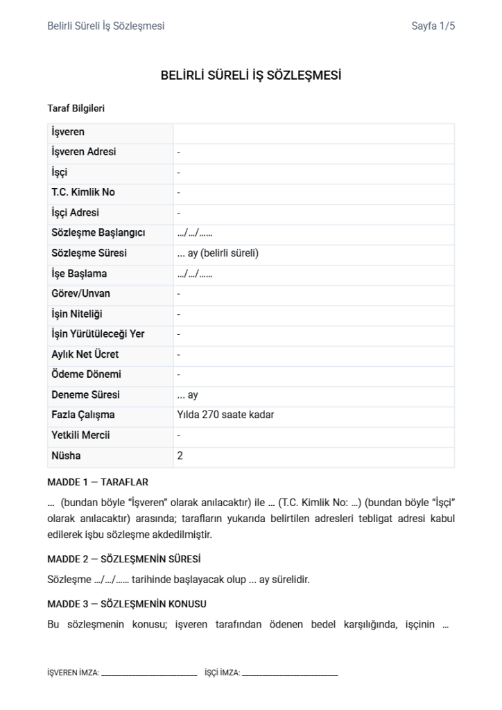 Belirli süreli iş sözleşmesi, iş ilişkisinin belirli bir süre veya işin tamamlanmasına kadar devam edeceğini düzenleyen resmi bir metindir. Bu sözleşme, işveren ile çalışan arasındaki hak ve yükümlülükleri açık şekilde ortaya koyar.