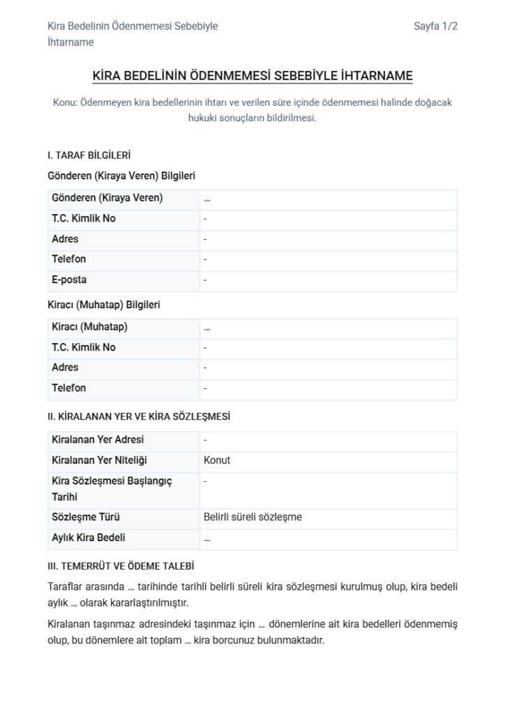 Kira bedelinin ödenmemesi Sebebiyle İhtarnameni, 5 dakikada senden istenen bilgileri girerek oluşturabilirsin