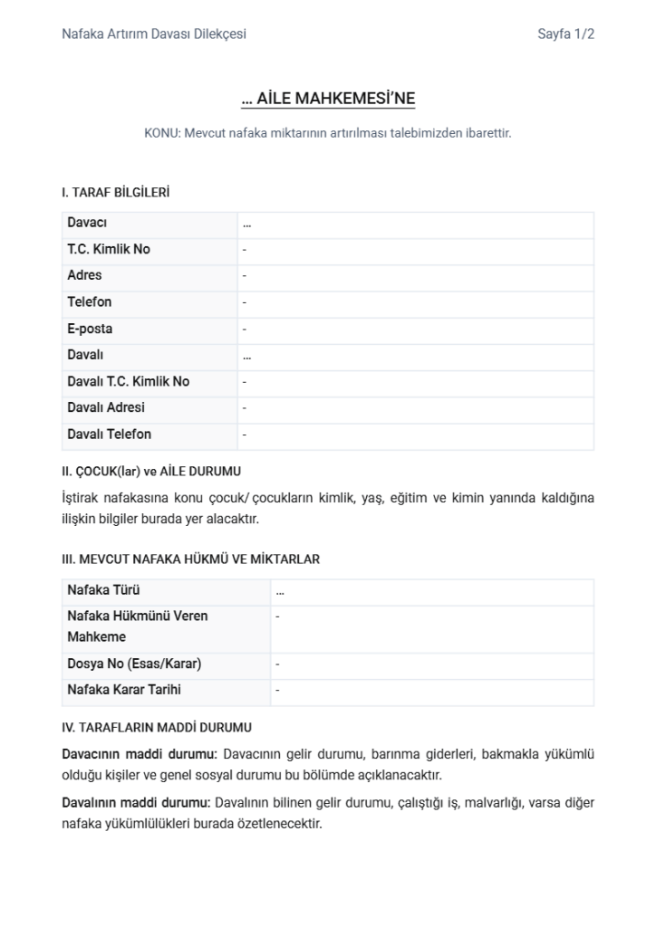 Nafaka artırım davası, tarafların ekonomik koşullarındaki değişiklikler nedeniyle mevcut nafaka tutarının yeniden belirlenmesi amacıyla açılır. Bu dilekçe, nafakanın güncel ihtiyaçlara uygun şekilde artırılması talebinin mahkemeye iletilmesi için hazırlanır.