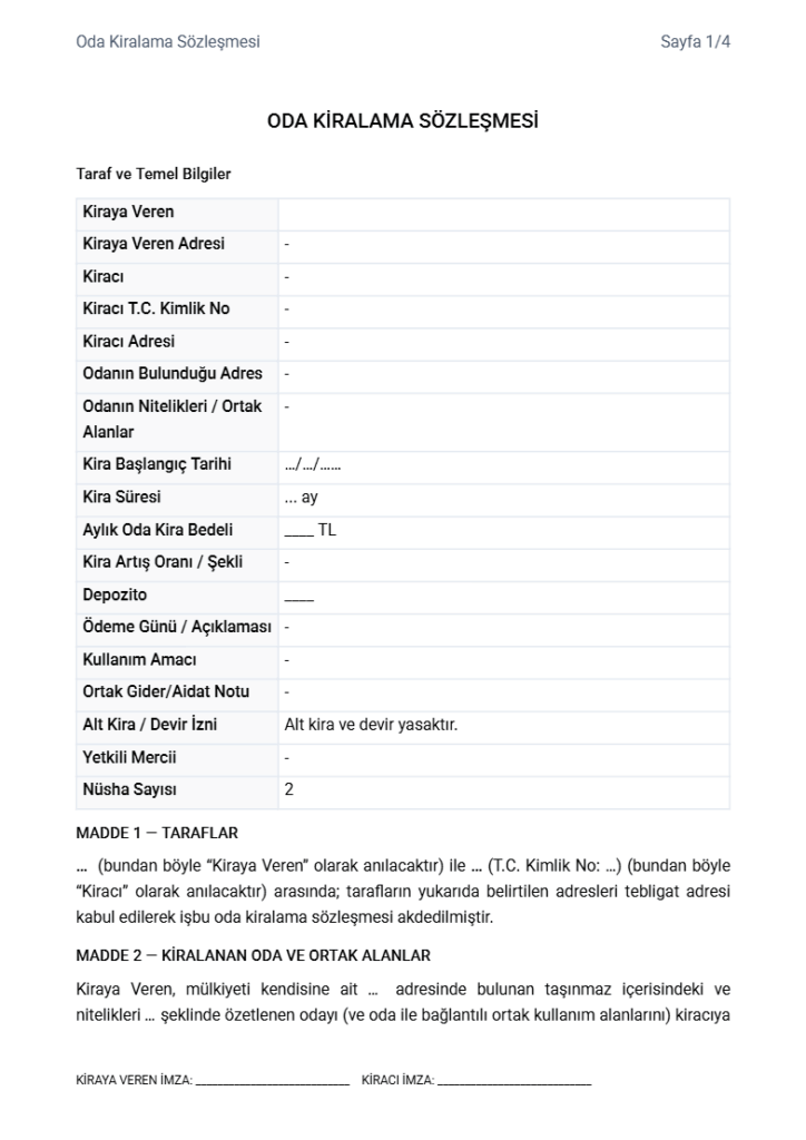 - Oda kiralama sözleşmeleri, hem odanın kullanımına hem de ortak alan düzenine ilişkin hükümler içerdiğinden, bilgilerin doğru ve eksiksiz verilmesi önemlidir.