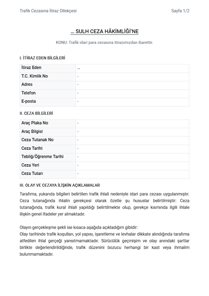 Trafik Cezasına İtiraz Dilekçeni, 5 dakikada senden istenen bilgileri girerek oluşturabilirsin