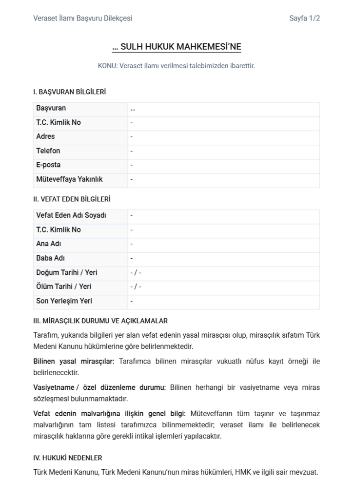 Veraset İlamı Başvuru Dilekçeni, 5 dakikada senden istenen bilgileri girerek oluşturabilirsin